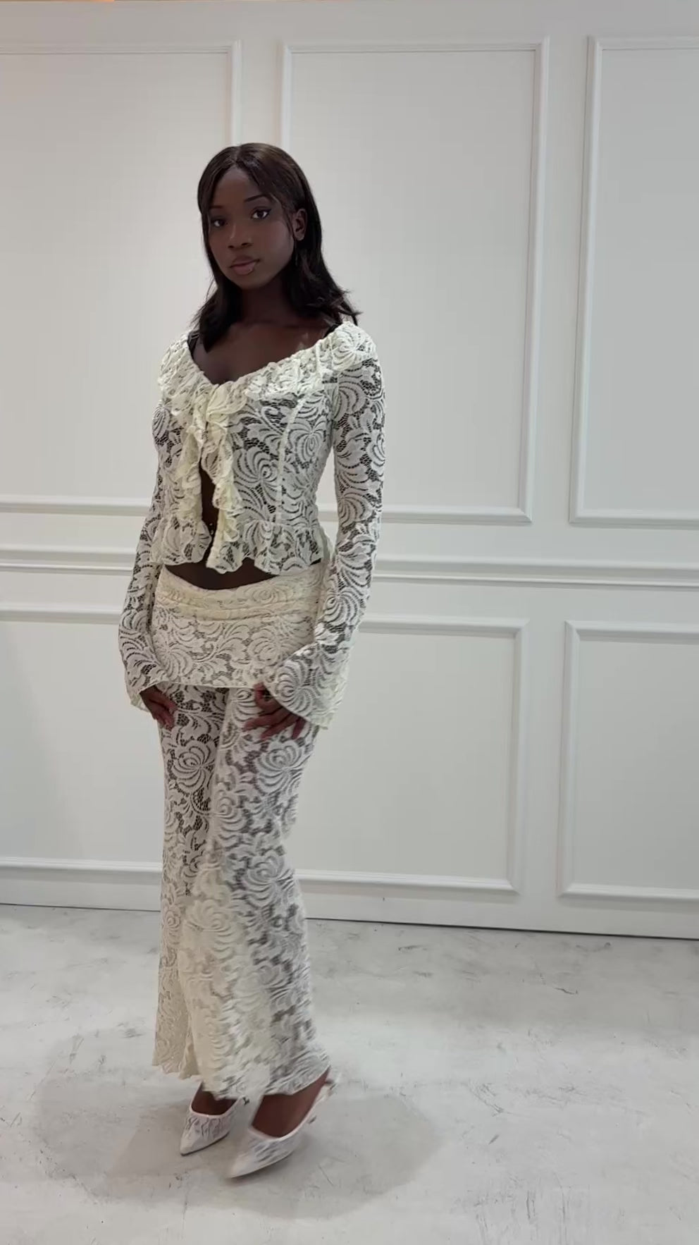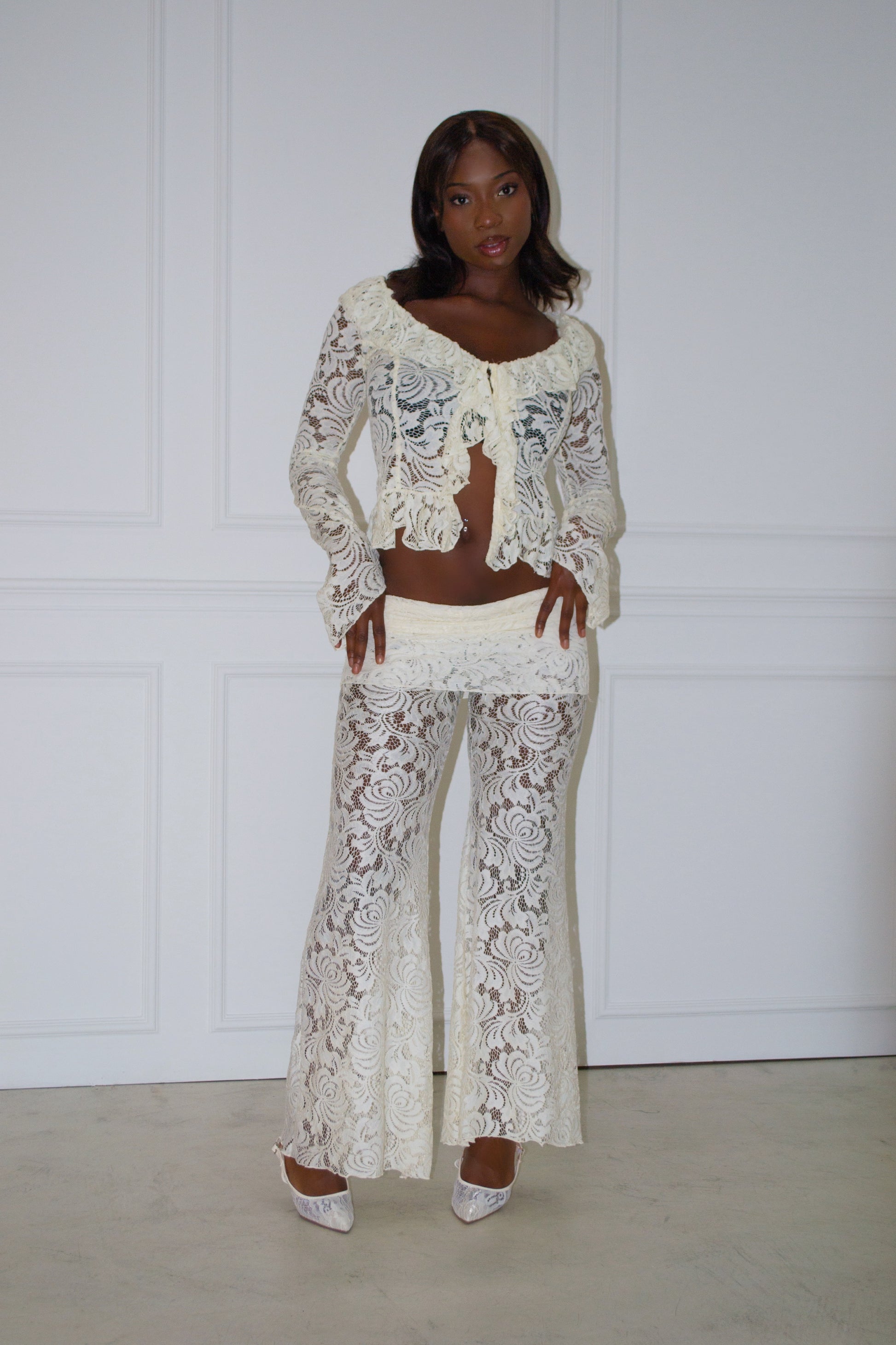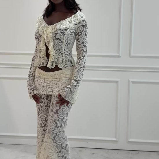 Delicate lace blouse with ruffled sleeves and matching lace trousers from Insomnia Studio. Rent this elegant set from Curated by Charl!